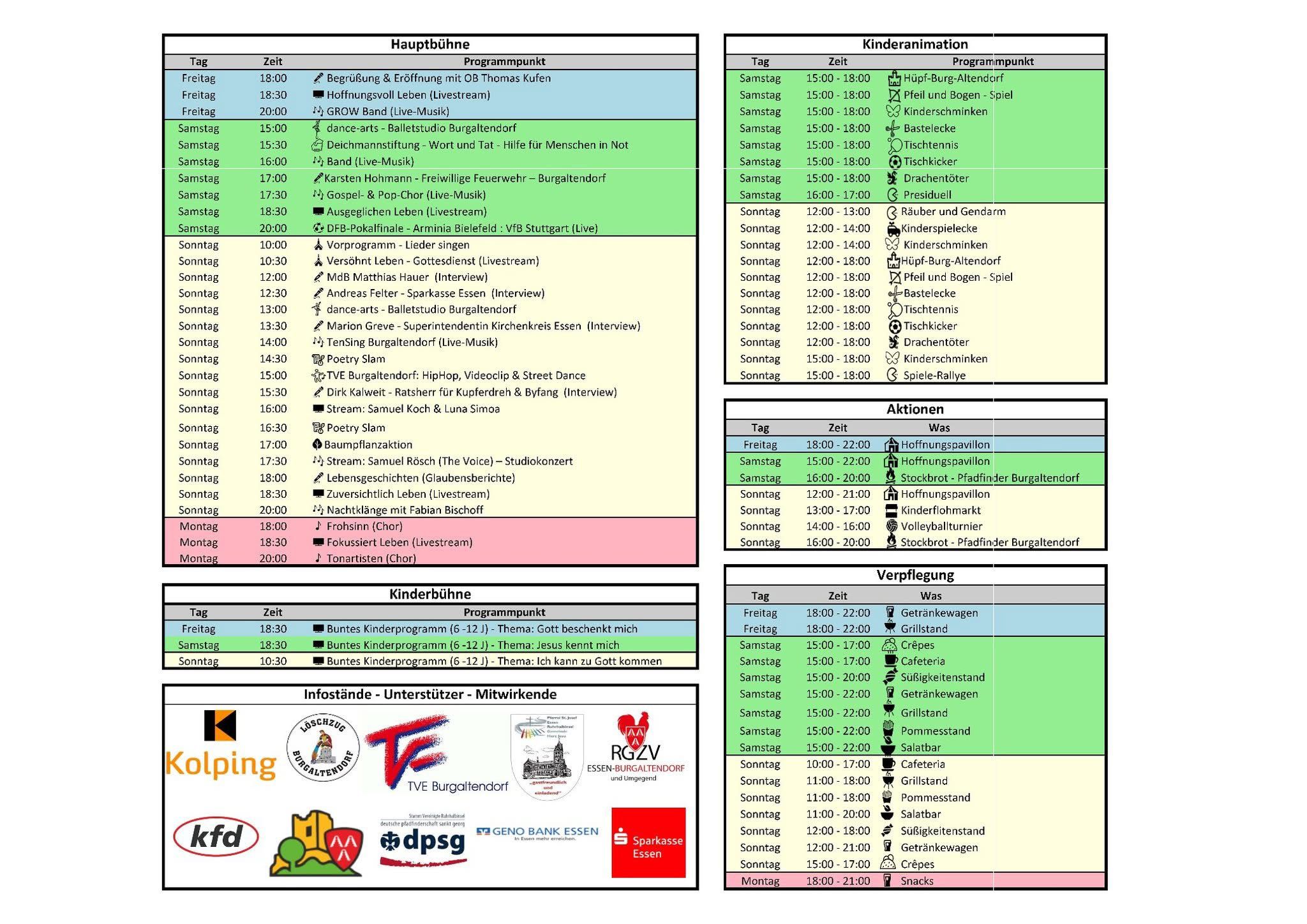 Das Hoffnungsfestival ist ein Gemeinschaftsprojekt vieler engagierter Gruppen und Institutionen aus Burgaltendorf: Mit dabei sind u. a. die Kolpingsfamilie, die Freiwillige Feuerwehr, der Heimat- und Burgverein, RGZV, TVE, KFD, die Herz-Jesu-Gemeinde, die Chöre Frohsinn und tonARTisten, das dance-arts Ballettstudio, das soziale Netzwerk, die Pfadfinder, Sparkasse, Genobank, OB Thomas Kufen, MdB Matthias Hauer, Bezirksbürgermeister Wilhelm Kohlmann und Ratsherr Dirk Kalweit – sowie viele weitere helfende Hände.